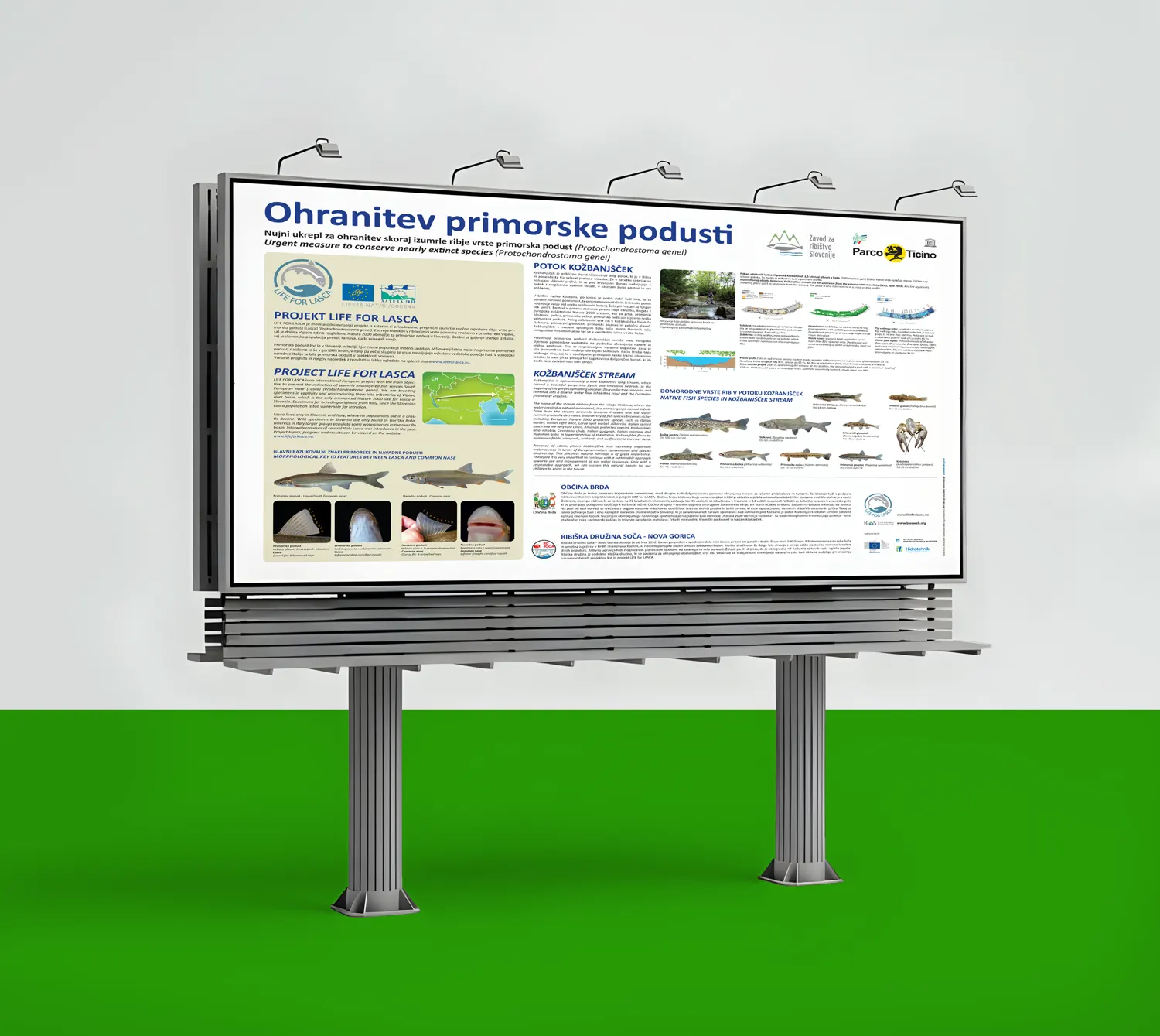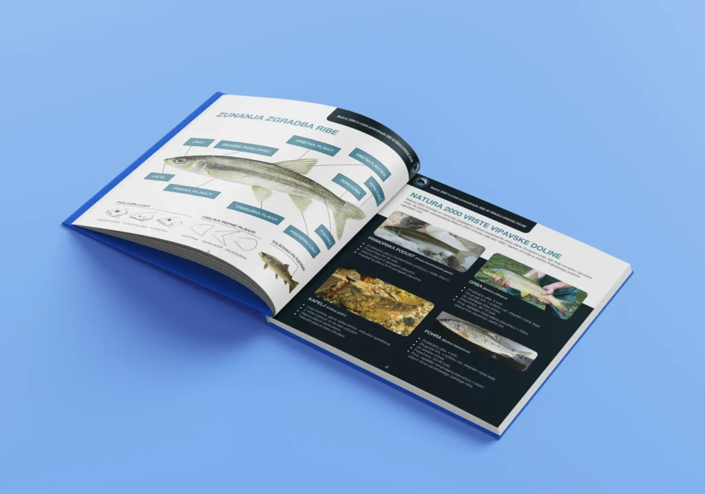 ” Oblikovali smo tudi obvestilne in informativne panoje, ki so na lokaciji. Panoji vsebujejo shematični prikaz poselitve iz italijanskega vodotoka k nam in obenem informirajo obiskovalca o ribjih vrstah, ki jih živijo na lokaciji. “