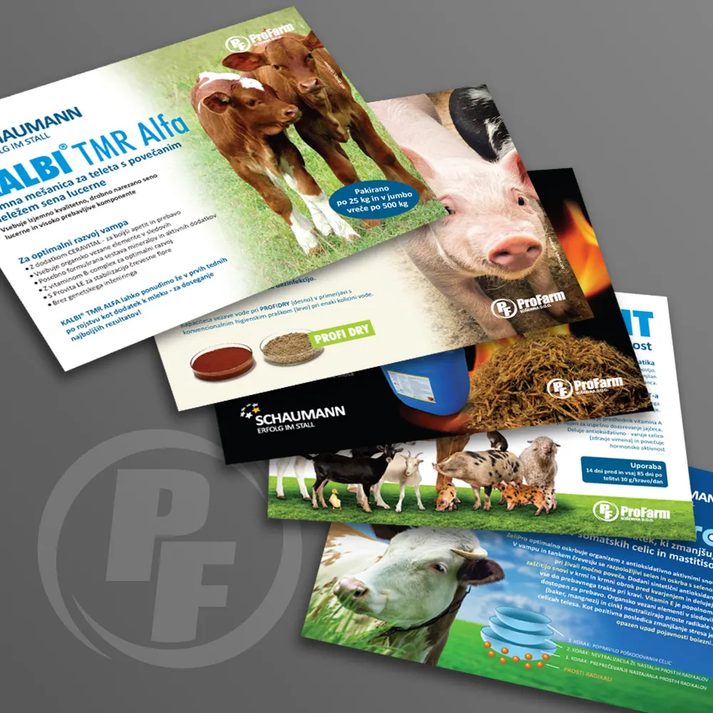 Trgovsko podjetje PROFARM je potrebovalo novo sodobnejšo Celostno grafično podobo. V ta namen smo v skladu z naročnikom idejno zasnovali podobo, ki deloma vključuje likovno postavitev in podobne barve kot predhodna, da ne izgubimo prepoznavnosti pri stalnih strankah.