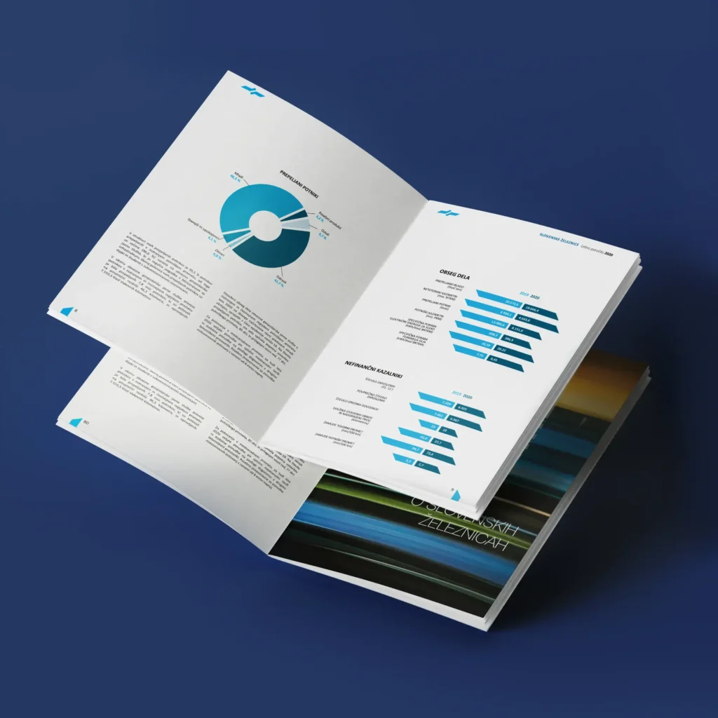 ” Letno poročilo odseva novo poglavje v Slovenskih železnicah, v teh letih so se lotili tudi spreminjanja celostne podobe voznega parka na modro. V tem duhu je zasnovana tudi rdeča (modra) nit likovnega pristopa.  “